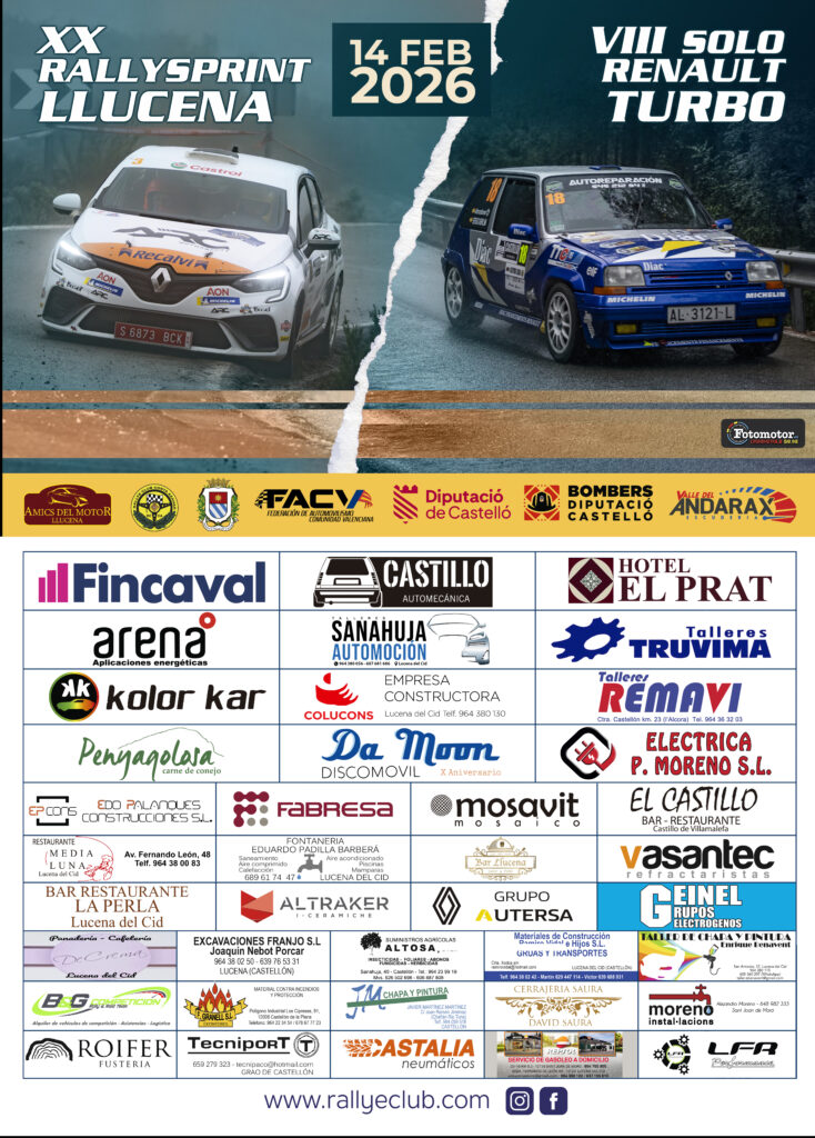 El próximo 14 de febrero se celebra la prueba denominada «XX Rallysprint de Lucena» organizada por el Rallye Club Costa Azahar Toda la información en https://www.rallyeclub.com/